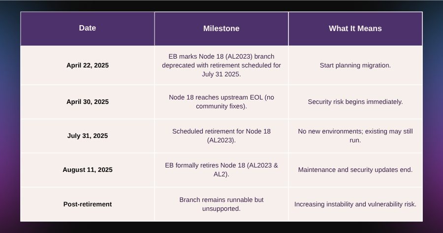 AWS Elastic Beanstalk (EB) is actively retiring Node 18 across its platform branches.