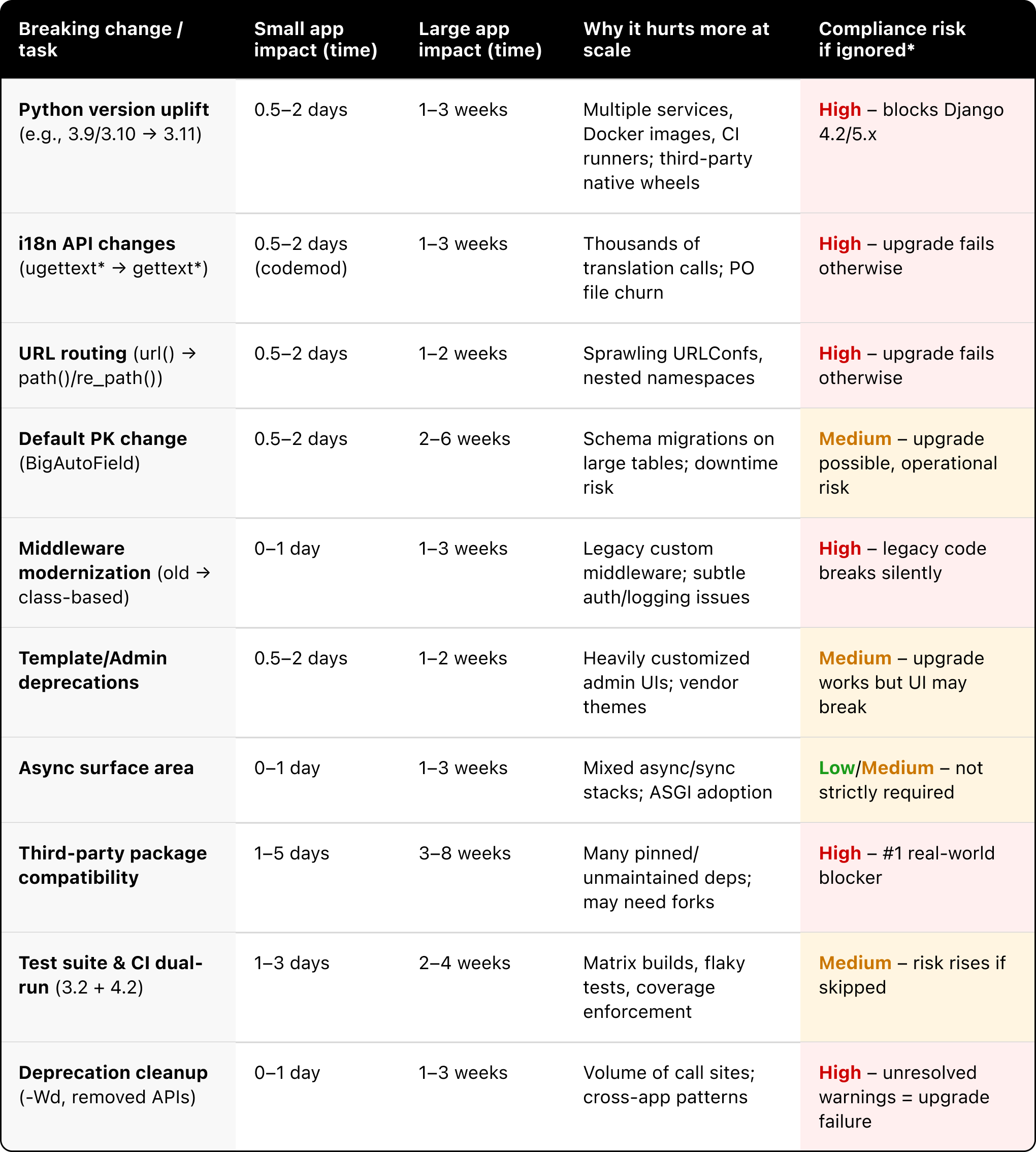 Here are the most impactful breaking changes when migrating Django 3.2 → 4.2/5.x — with effort estimates by project size: